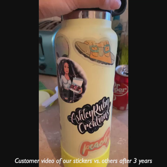 Our stickers are made of high quality, waterproof vinyl. If you choose our glossy finish, they'll have an added layer of high gloss laminate that adds even more protection making them dishwasher safe!
